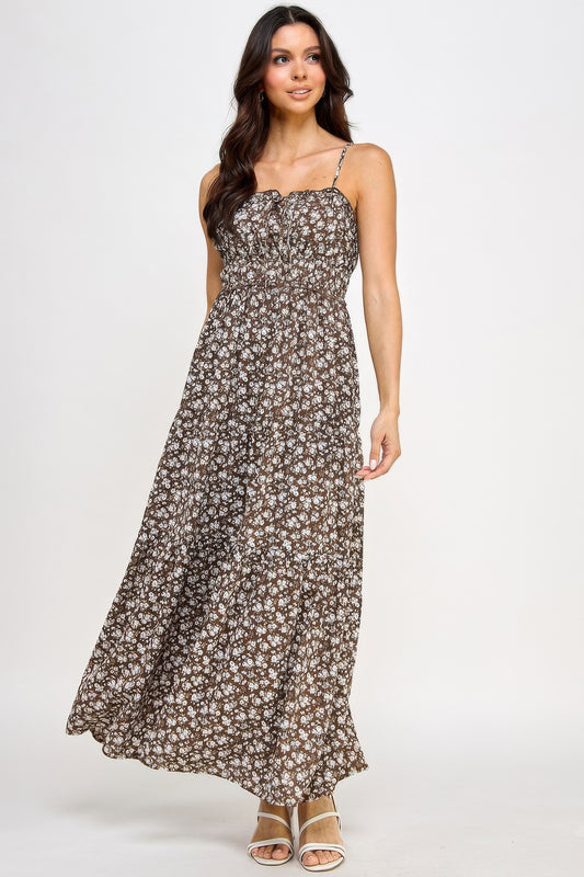 Floral Print Pocket Sleeveless Smocked Split Dress