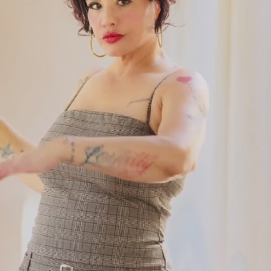 This dress combines classic plaid with modern design elements, offering a flattering silhouette and a versatile style that can easily transition from day to night. The adjustable straps and belted waist ensure a perfect fit, while the pleated detailing adds a touch of femininity.